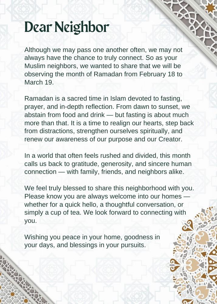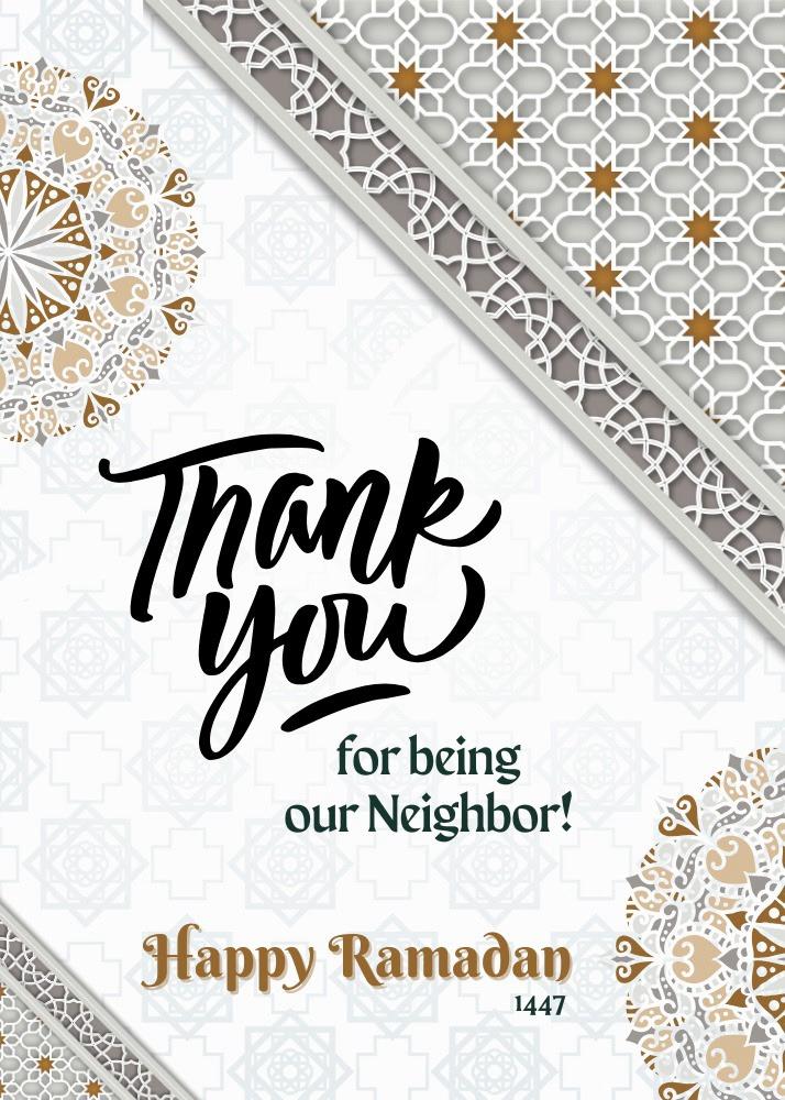 Simply attach our pre-printed Ramadan cards to a small gift — 🌿 a plant, 🍫 a box of chocolates, or any sealed/packaged Ramadan treat — and personally deliver it to your neighbors.
